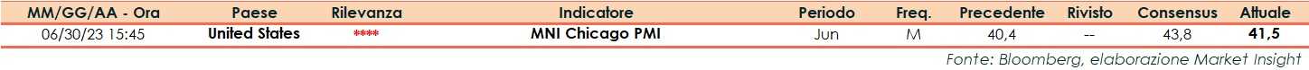 L’indice PMI che misura l’andamento dell’attività manifatturiera nella zona di Chicago, si è attestato, nel mese di giugno, a 41,5 punti, inferiore alle attese degli analisti (43,8 punti) ma superiore al dato di maggio (40,4 punti).