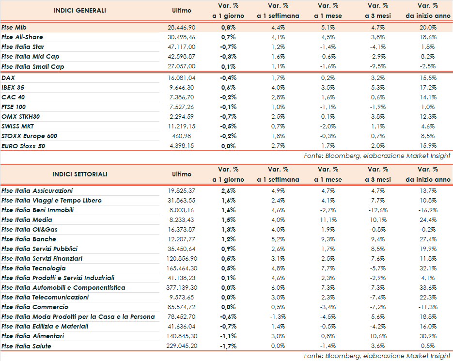 A Milano, il Ftse Mib chiude le contrattazioni in area 28.446 punti (+0,8%), in rialzo come l’Ibex 35 di Madrid (+0,6%), mentre perdono terreno il Dax di Francoforte (-0,4%), il Cac 40 di Parigi (-0,2%) e il Ftse 100 di Londra (-0,1%).