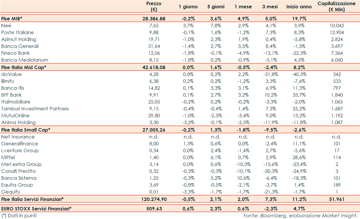 Il Ftse Italia Servizi Finanziari nella seduta di ieri ha riportato un -0,5% rispetto al +0,6% del corrispondente europeo e al -0,2% del Ftse Mib.
