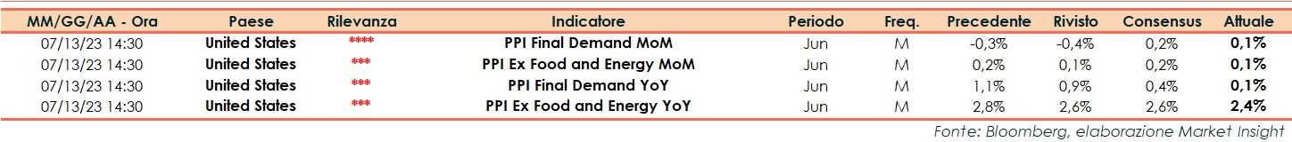 Il Dipartimento del Lavoro degli Stati Uniti ha reso noto che nel mese di giugno l’indice grezzo dei prezzi alla produzione (PPI) ha evidenziato un incremento dello 0,1% su base mensile, inferiore alle attese degli analisti (+0,2%), e dopo il -0,4% di maggio (rivisto da -0,3%). Su base annua, il PPI si è attestato al +0,1%, inferiore alle stime (+0,4%) e dopo il +0,9% del mese precedente (rivisto da +1,1%).