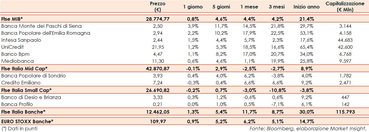 Nella seduta di ieri il Ftse Italia Banche ha riportato un +1,3% a fronte del +0,9% dell’analogo indice europeo e del +0,8% del Ftse Mib.