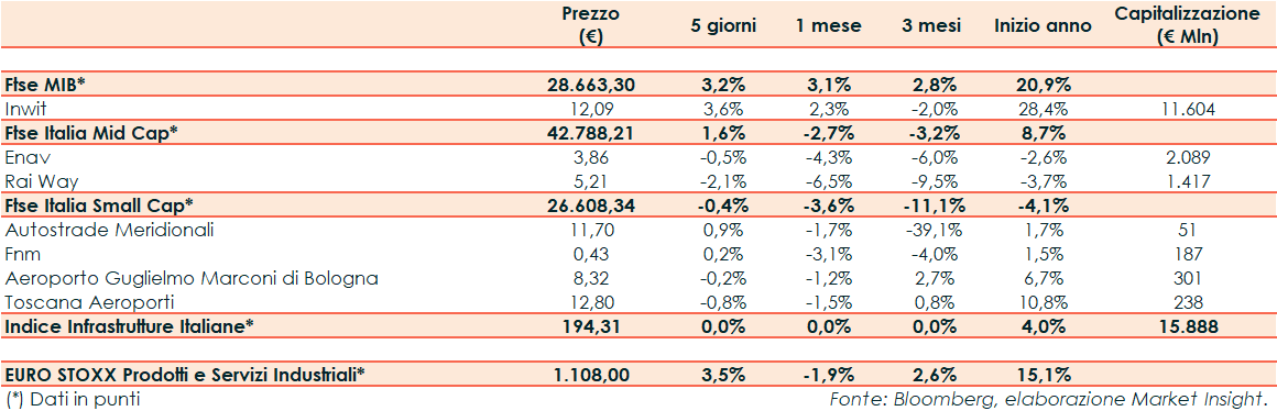 La scorsa settimana l’indice Infrastrutture Italiane ha riportato una sostanziale parità rispetto al +3,5% del corrispondente europeo e al +3,2% del Ftse Mib.