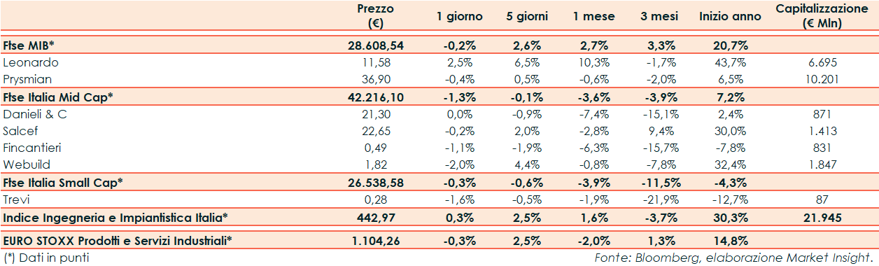 Nella seduta di ieri l’indice Ingegneria e Impiantistica ha riportato un +0,3% rispetto al -0,3% del corrispondente europeo e al -0,2% del Ftse Mib.