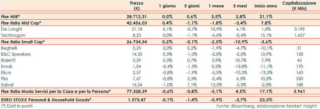 Nella seduta di ieri il Ftse Italia Moda Servizi per la Casa e per la Persona ha riportato un -0,6% rispetto al -0,1% del corrispondente europeo e alla parità del Ftse Mib.