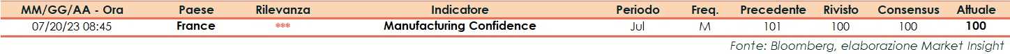 Secondo l’Ufficio Statistico Nazionale Francese (INSEE), a luglio l’indice relativo al sentiment dell’industria manifatturiera si è fissato a 100 punti, in linea con consensus e il dato di giugno (rivisto da 101 punti).