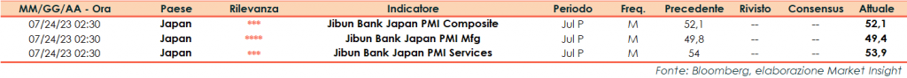Il dato preliminare del PMI servizi della Jibun Bank è stato pari invece a 53,9 punti, appena sotto i 54 punti del mese precedente. Infine, il dato riguardante il PMI composito si è attestato a 52,1 punti, stabile rispetto a giugno.