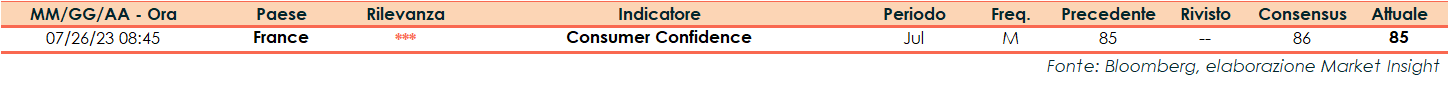 L’Ufficio Statistico Nazionale francese (Insee) ha comunicato che a luglio l’indice che misura la fiducia dei consumatori francesi si è attestato a 85 punti, stabile rispetto a giugno ma al di sotto delle attese (86 punti).