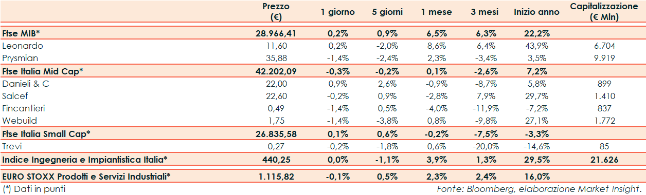 Nella seduta di ieri l’indice Ingegneria e Impiantistica ha riportato una variazione nulla rispetto al -0,1% del corrispondente europeo e al +0,2% del Ftse Mib.