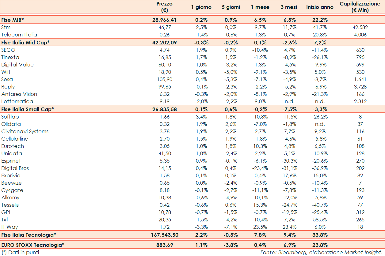 Nella seduta di ieri il Ftse Italia Tecnologia ha riportato un +2,2% rispetto al +1,1% dell’Euro Stoxx Tecnologia e al +0,2% del Ftse Mib.