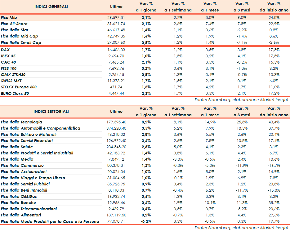 A Milano, il Ftse Mib ha archiviato le contrattazioni in area 29.597 punti (+2,1%), bene come il Cac 40 di Parigi (+2,1%) e il Dax di Francoforte (+1,7%). Più contenuti i guadagni sull’Ibex 35 di Madrid (+1%) e il Ftse 100 di Londra (+0,2%).