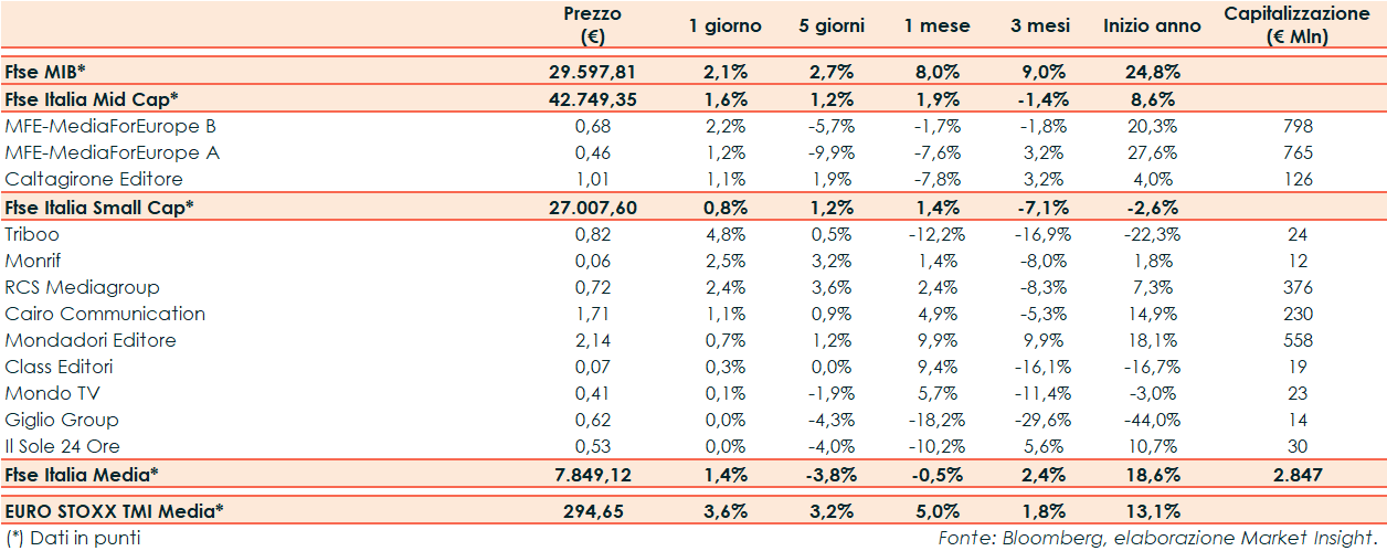 Tra le Mid Cap MFE-MediaForEurope B ha segnato un +2,2%, MFE-MediaForEurope A un +1,2% e Caltagirone Editore un +1,1%.