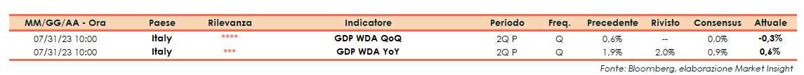 Nel secondo trimestre 2023 (dato preliminare) il prodotto interno lordo (Pil), corretto per gli effetti di calendario e destagionalizzato, è calato dello 0,3% su base trimestrale, al di sotto del consensus (0,0%) e del +0,6% registrato nel primo trimestre 2023.