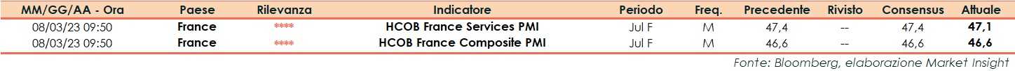 A luglio il dato finale dell’indice Pmi servizi francese si è attestato a 47,1 punti, inferiore alle attese e al dato preliminare, entrambi a 47,4 punti. Il dato finale di giugno era pari a 48 punti.