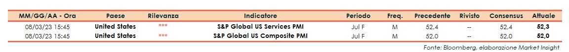 S&P ha reso noto che nel mese di luglio il dato finale dell’indice Pmi Servizi degli Stati Uniti si è attestato a 52,3 punti, leggermente al di sotto del dato preliminare e del consensus, entrambi a 52,4 punti. A giugno il dato finale era pari a 54,4 punti.