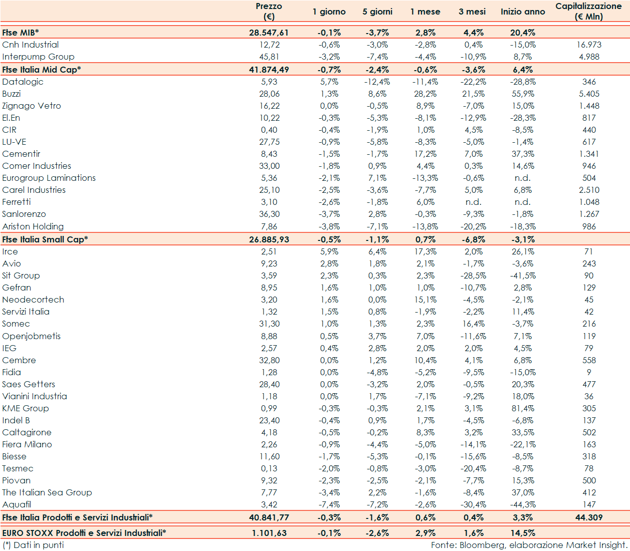 Iieri il Ftse Italia Prodotti e Servizi Industriali ha riportato un -0,3% rispetto al -0,1% del corrispondente europeo e del Ftse Mib.