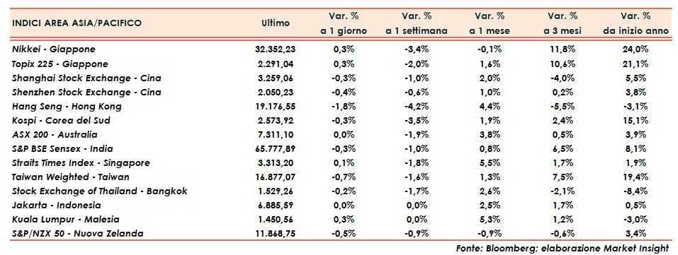 In Cina, Shanghai cede lo 0,3% e Shenzhen lo 0,4%, maggiori vendite su Hong Kong (-1,8%). Tiene invece il Giappone con Nikkei e Topix, entrambi +0,3%.
