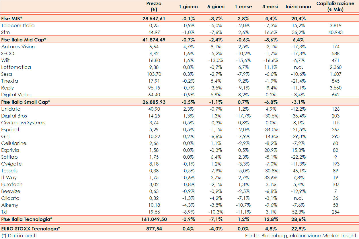 Ieri scorsa il Ftse Italia Tecnologia ha riportato un -0,9% rispetto al +0,4% del corrispondente europeo e al -0,1% del Ftse Mib.