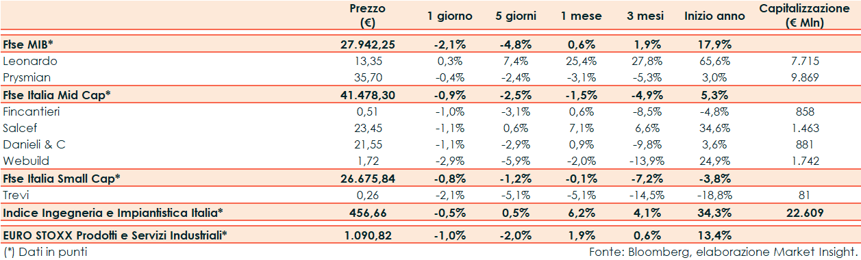Ieri il Ftse Italia Ingegneria e Impiantistica ha riportato un -0,5% rispetto al -1,0% del corrispondente europeo e al -2,1% del Ftse Mib.
