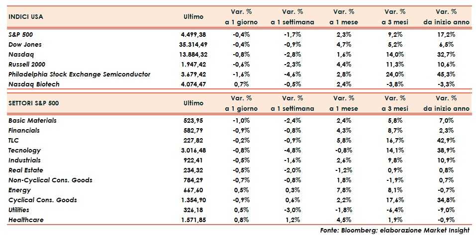 Il bilancio definitivo registra S&P500 e Dow Jones in calo dello 0,4%, Nasdaq (-0,8%) e Russell 2000 (-0,6%).