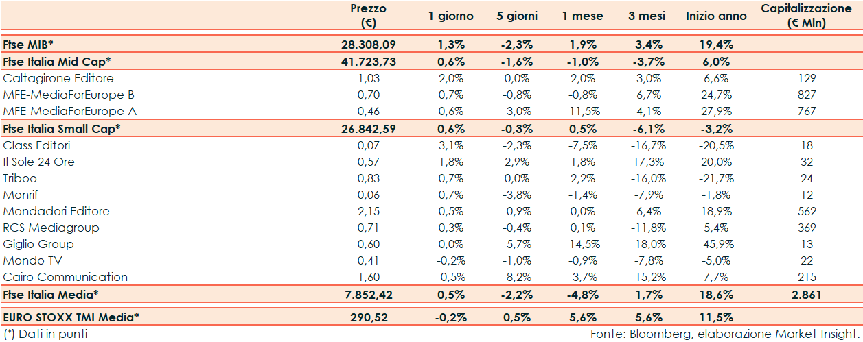 Infine, tra le Small, Class Editori (+3,1%) e Il Sole 24 Ore (+1,8%) sono state le migliori mentre Cairo Communication (-0,5%) ha sottoperformato il paniere.