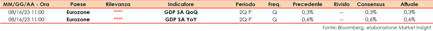 La seconda stima preliminare per il Pil dell’Eurozona del secondo trimestre 2023 indica un aumento dello 0,3% su base trimestrale, in linea con il consensus e la prima lettura. Il dato su base annua risulta anch’esso in crescita (+0,6%), in linea con le attese e con il dato precedente.