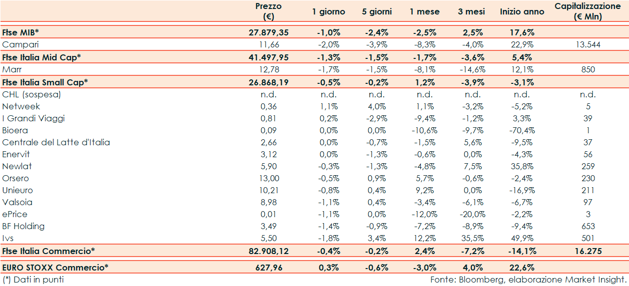 Ieri il settore del commercio ha riportato un -0,4% rispetto al +0,3% del corrispondente europeo e al -1,0% del Ftse Mib.
