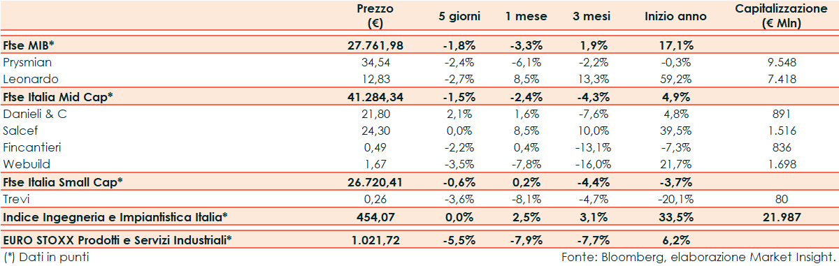 La scorsa settimana il Ftse Italia Ingegneria e Impiantistica ha riportato una performance stabile rispetto al -5,5% del corrispondente europeo e al -1,8% del Ftse Mib.
