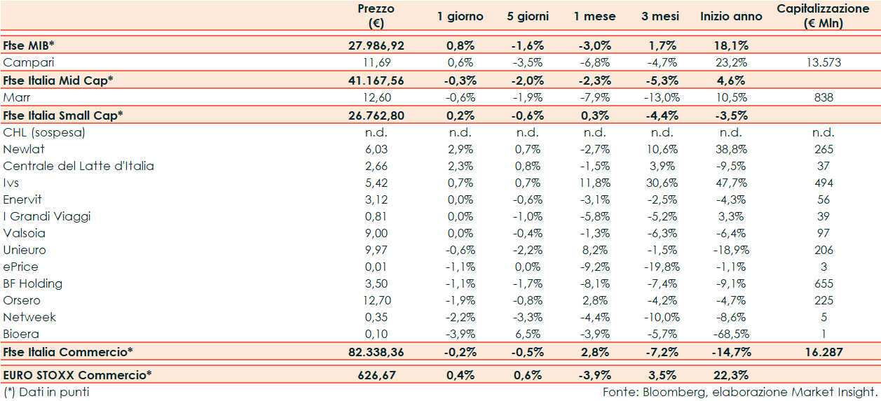 Ieri il settore del commercio ha riportato un -0,2% rispetto al +0,4% del corrispondente europeo e al +0,8% del Ftse Mib.