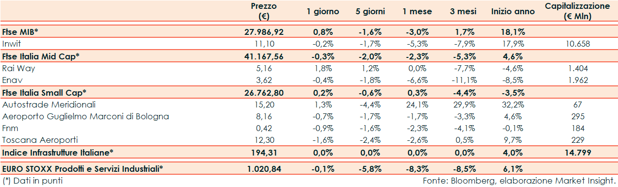 Ieri il Ftse Infrastrutture Italiane ha riportato una performance stabile rispetto al -0,1% del corrispondente europeo e al +0,8% del Ftse Mib.