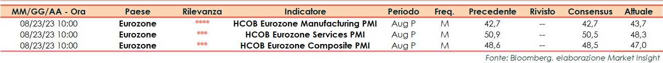 Infine, l’indice Pmi Composito ha segnato un valore di 47 punti, inferiore ai 48,5 punti del consensus e ai 48,6 punti di luglio.