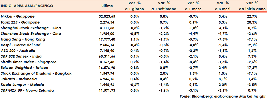 In Cina, Shanghai cede lo 0,3% e Shenzhen lo 0,8%, mentre Hong Kong avanza dell’1,1%%. Positivo anche il Giappone con Nikkei e Topix entrambi a +0,5%.