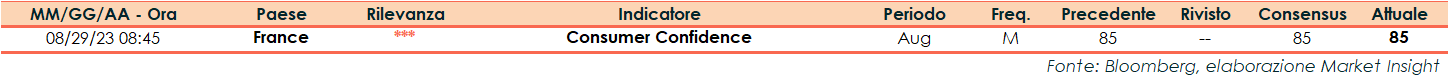 L’Ufficio Statistico Nazionale francese (Insee) ha comunicato che ad agosto l’indice che misura la fiducia dei consumatori francesi si è attestato a 85 punti, stabile rispetto a luglio e in linea con le attese.