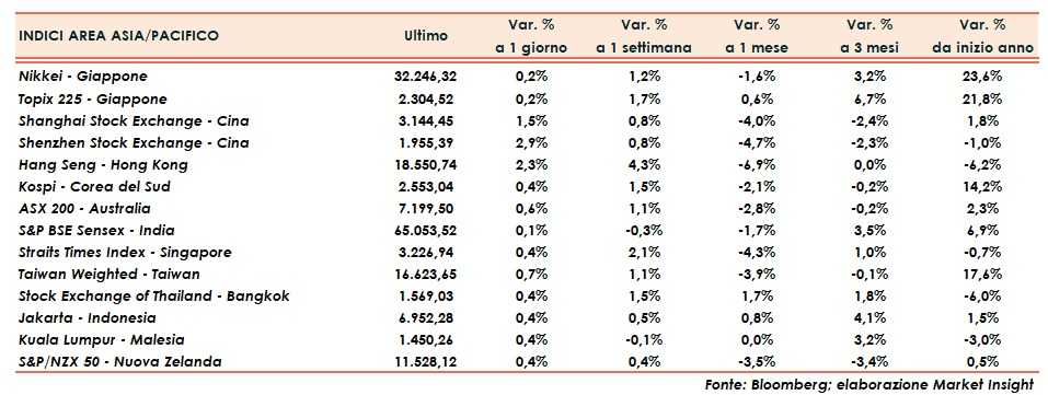 In Cina, Shanghai avanza dell’1,5% e Shenzhen del 2,9%, bene come Hong Kong a +2,3%. Più cauto il Giappone con Nikkei e Topix, entrambi a +0,2%.