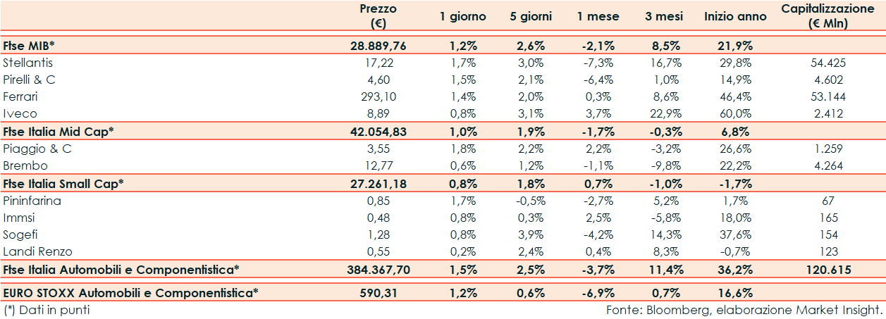 Ieri il Ftse Italia Automobili e Componentistica ha riportato un +1,5% rispetto al +1,2% del corrispondente europeo e del Ftse Mib.