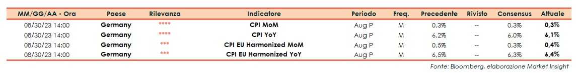 La lettura preliminare di agosto dell’indice dei prezzi al consumo, diffusa dall’Istituto federale tedesco di statistica, ha segnato un +0,3% su base mensile, stabile rispetto al mese precedente e in linea al consensus.