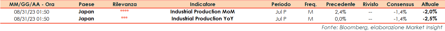 Secondo la lettura preliminare del Ministero dell’Economia, del Commercio e dell’Industria giapponese, a luglio il dato sulla produzione industriale ha segnato un calo del 2,0% su base mensile, in peggioramento oltre le attese (-1,4%) e a fronte del +2,4% di giugno.