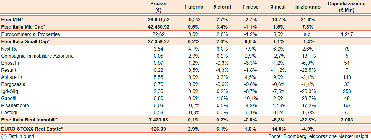Infine, tra le Small, Next Re (+4,1%) e Compagnia Immobiliare Azionaria (+2,9%) sono state le migliori mentre Bastogi (-0,3%) si è posizionata in fondo al paniere.