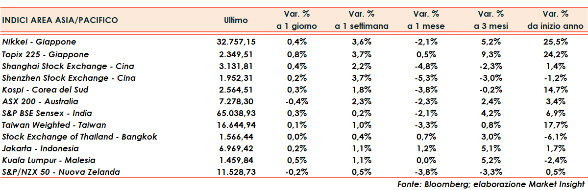 Shanghai guadagna lo 0,4% e Shenzhen lo 0,2%, meglio il Giappone con Nikkei a +0,4% e Topix a +0,8%.