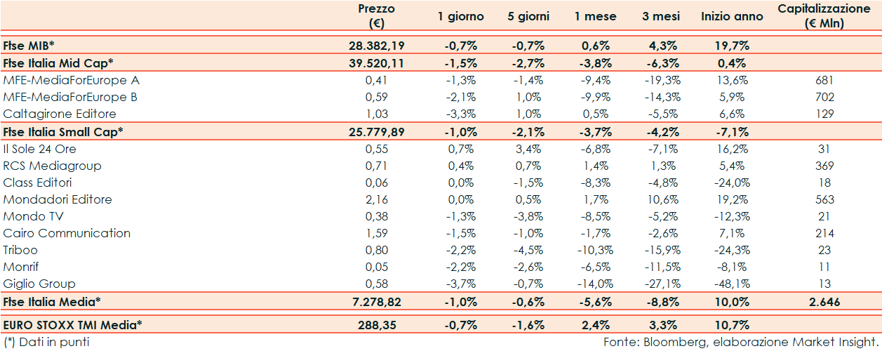 Tra le Mid Cap MFE-MediaForEurope A ha segnato un -1,3%, MFE-MediaForEurope B un -2,1% e Caltagirone Editore un -3,3%.