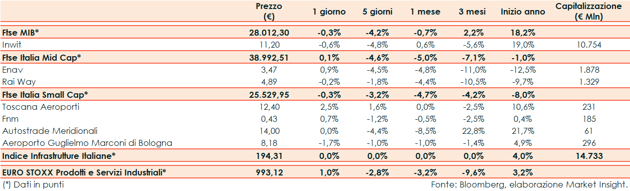 Ieri il Ftse Infrastrutture Italiane ha riportato una performance stabile rispetto al +1,0% del corrispondente europeo e al -0,3% del Ftse Mib.