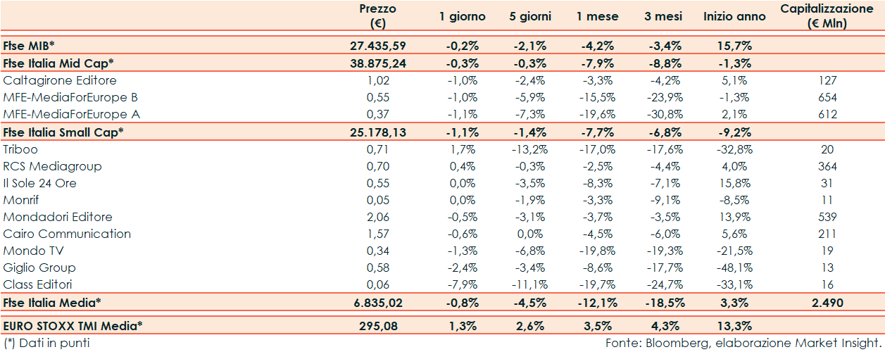 Infine, tra le Small, Triboo (+1,7%) e RCS Mediagroup (+0,4%) sono state le migliori mentre Class Editori (-7,9%) ha sottoperformato il paniere.