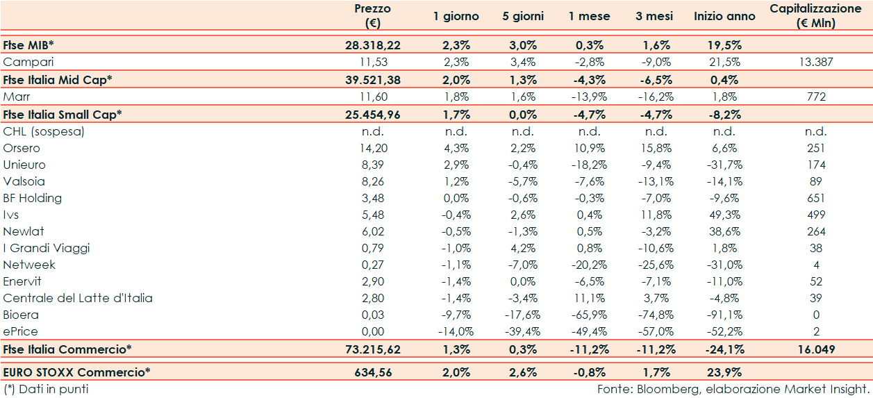 Ieri il settore del commercio ha riportato un +1,3% rispetto al +2,0% del corrispondente europeo e al +2,3% del Ftse Mib.