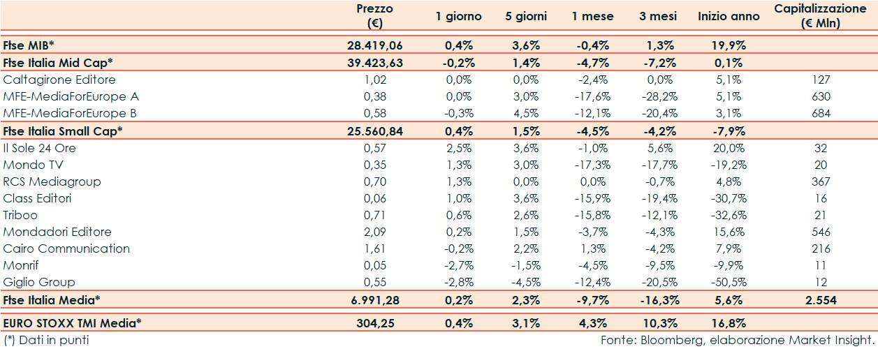 Tra le Mid Cap Caltagirone Editore e MFE-MediaForEurope A hanno segnato una variazione nulla mentre MFE-MediaForEurope B ha registrato un -0,3%.