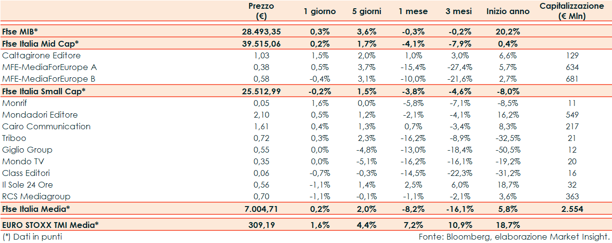 Infine, tra le Small, Monrif (+1,6%) e Mondadori Editore (+0,5%) sono state le migliori mentre RCS Mediagroup (-1,1%) ha sottoperformato il paniere.