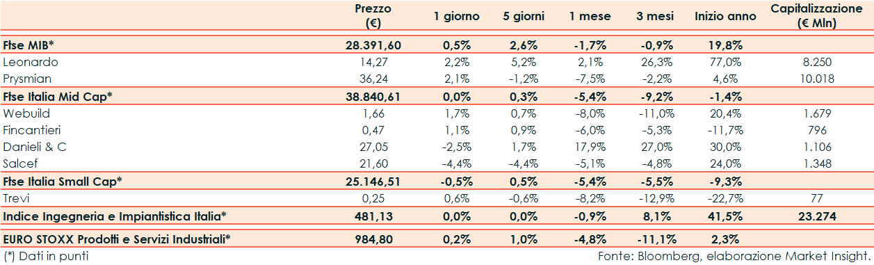 Ieri il Ftse Italia Ingegneria e Impiantistica ha riportato una performance stabile rispetto al +0,2% del corrispondente europeo e al +0,5% del Ftse Mib.