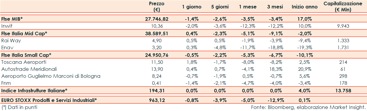 Ieri il Ftse Infrastrutture Italiane ha riportato una performance stabile rispetto al -0,8% del corrispondente europeo e al -1,4% del Ftse Mib.