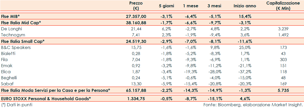 La scorsa settimana il Ftse Italia Moda Servizi per la Casa e per la Persona ha riportato un -2,2% rispetto al -0,5% del corrispondente europeo e al -3,1% del Ftse Mib.