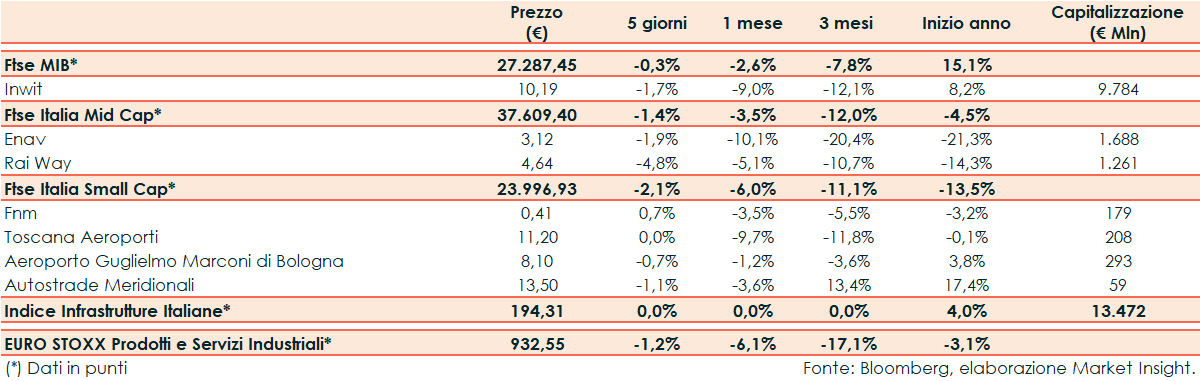 La scorsa settimana il Ftse Infrastrutture Italiane ha riportato una performance stabile rispetto al -1,2% del corrispondente europeo e al -0,3% del Ftse Mib.