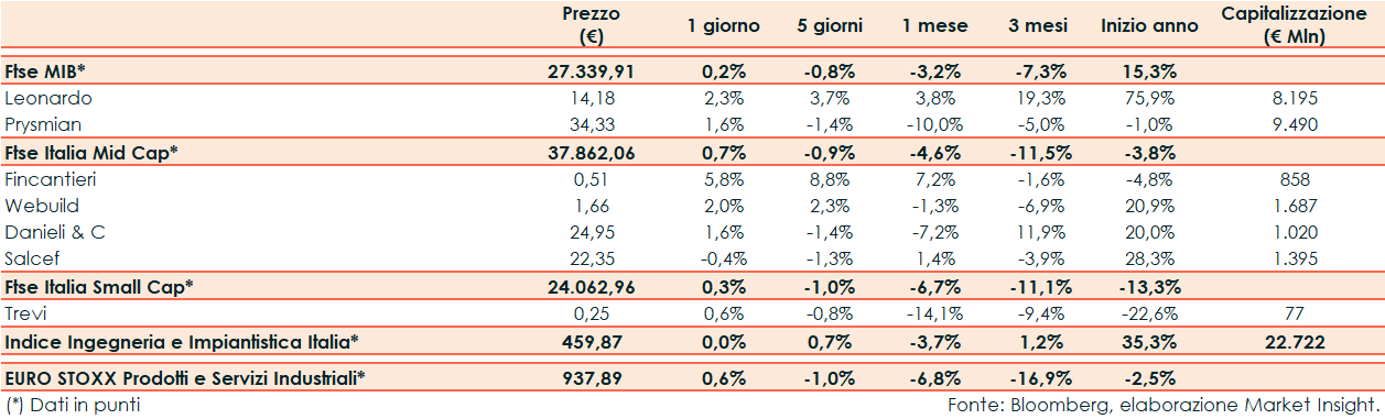 Ieri il Ftse Italia Ingegneria e Impiantistica ha riportato una performance stabile rispetto al +0,6% del corrispondente europeo e al +0,2% del Ftse Mib.