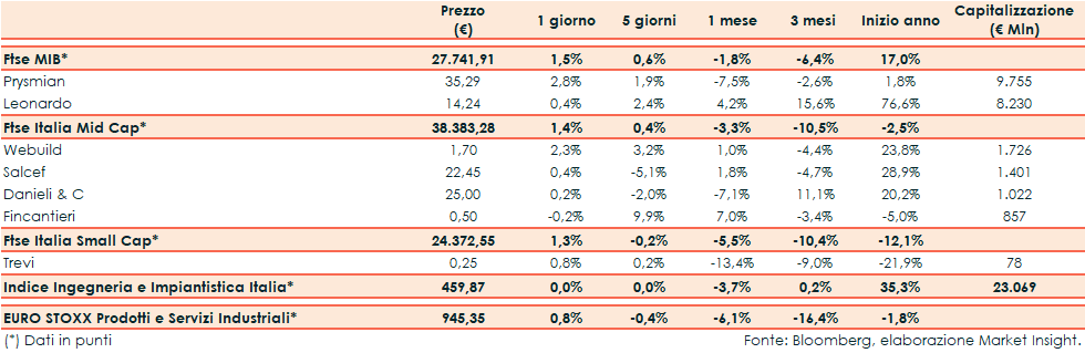 Ieri il Ftse Italia Ingegneria e Impiantistica ha riportato una performance stabile rispetto al +0,8% del corrispondente europeo e al +1,5% del Ftse Mib.
